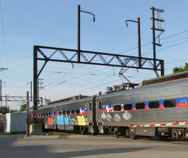 | Unfortunately, the need to have every piece of equipment out on the road, combined with the idle hands of vandals, have resulted in some unwanted added color. Normally this would be cleaned up before the cars were put into service, but the practicalities of the current situation preclude that. At least five Silverliner IV's have been seen tagged and there are reports that the Silverliner V's parked at various yards across the system have been sitting ducks as well. The SL IV's operated a few days in this state before the grafitti was removed. July 12 2016 |