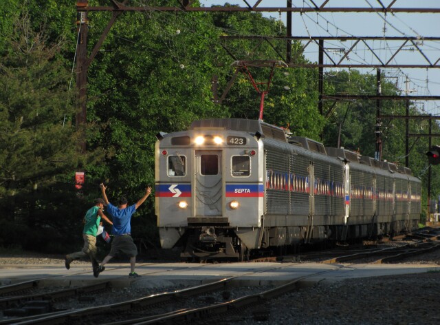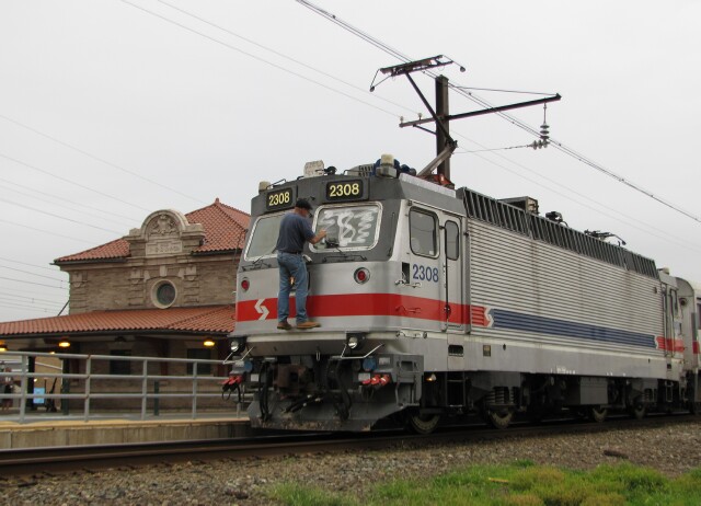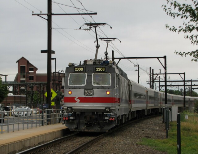 | The sidelining of the Silverliner V's has brought interesting sights to the area. The return of "juice jacks" to Lansdale is one of them and the quick turns they make provide photographers with a rare sight: the two pan shot. SEPTA normally runs with the leading pan up, and just for a moment, you can see this as they change ends. Of course, the appearance of SEPTA's only ALP-44 SPAX 2308 (the only engine of its kind still in service) is a bonus. July 8 2016 |