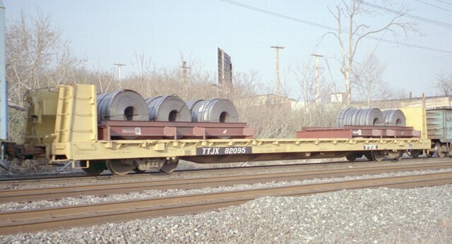 | TTX flat car with Conrail coil steel cradles TTJX 82095 April 1996 |
