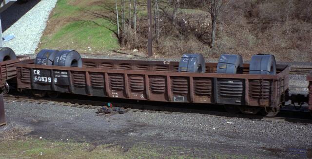 | Former Pennsylvania Railroad car in coil steel service on Conrail train PIMO. |