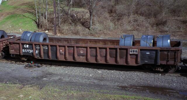 | ORER description: Gondola, steel fixed ends, steel floor, axle spacing 5' 10", truck centers 43' 8", AAR car type code E530, mechanical designation GBS. Former Penn Central car in service on Conrail train PIMO. |