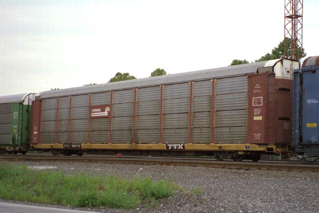 | TTX flat car with Conrail autorack ETTX 905732 July 1996 |