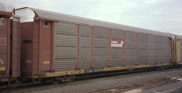 | TTX flat car TTGX 940759 with Conrail autorack July 1996 |