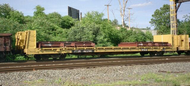 | TTX bulkhead flat car TTJX 82296 with Conrail coil steel cradles July 1996 |