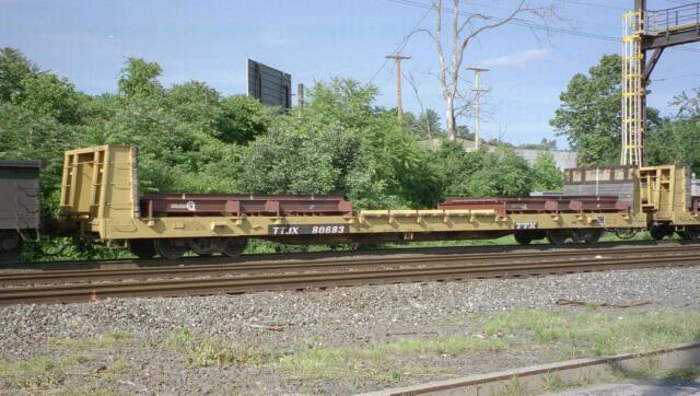| TTX bulkhead flat car TTJX 80683 with Conrail coil steel cradles July 1996 |