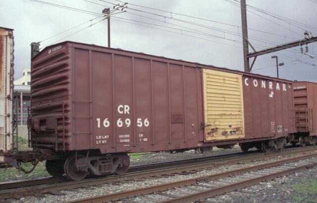 Former Penn Central Railroad car PCA 166956 14 panels (7/7), ribbed sides, roll door, tapered bottom sill |