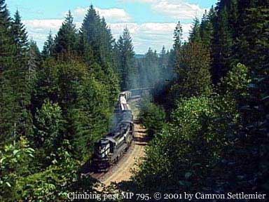 POTB 4432 lugs uphill clear of milepost 795 with an unusually heavy westbound train. Behind the brace of three SD-9's, the train that usually consists of empty centerbeams is joined by a loaded centerbeam, two loaded water tank cars for fire protection, and a pair of loaded covered hoppers full of feed for the Tillamook County Creamery Association. Photo by Camron Settlemier. August 19, 2001.