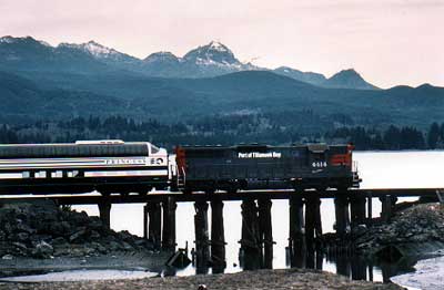 POTB 4414 rumbles east across the Cheviot Creek trestle with a refurbished Princess Tours super dome in tow. The car ismost likely TAIX 7091 "Mt. Susitna", formerly Milwaukee Road super dome 56 , which was rebuilt in Tillamook by Bob Steele for service on the California Sun Express. (Hence the large air conditioner unit that adorns the top of the dome.) The car now operates in Alaska for Hollanda America Westours as McKinley Explorer 56, named "Knik". Undated, uncredited photo from the Port of Tillamook Bay archives. Most likely taken some time around 1990.