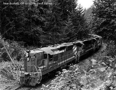 Port of Tillamook Bay 4414 and leased Burlington Northern SD-9's 6221 and 6126 glide downhill with the short-lived Karban rock train. The cars were loaded at a pit at Cochran, and taken down to Hillsboro to be unloaded. The BN units were leased until ex-SP 4405, 4406 and 4432 were added to the roster. Photo by Geoff Barnes. August, 1993.