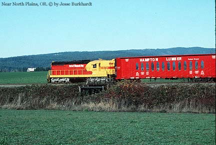 During the early days of the Port's operation over the Tillamook branch, the railroad handed off its interchange traffic to Burlington Northern at North Plains, about five miles from Banks along the former SP&S Cornelius Pass line. Traffic bound for the Southern Pacific and Union Pacific was interchanged at Mahan, near Hillsboro. The complex interchanges made it necessary for a second crew to do all of the switching once the train reached Banks. Here, the 4381 is on its way from North Plains to Banks after trading outbound loads for inbound empties. It's unusual to see this train moving during the day, as most of its operation took place after nightfall during most of the year. Photo by Jesse Burkhardt. Date unrecorded.