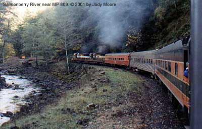 We'll continue our look at the Salmonberry River Canyon with this view from onboard the first Salmonberry Limited passenger train, operated by Sunset Coast Excursions in late October and early November, 2001. Here, the train is rolling along near MP 809 on its way uphill with the second leg of the trip on October 28, 2001. POTB GP-9 3771 and SD-9 4405 lead the five car train east. Even at this early afternoon hour, the sun hardly penetrates the deep canyon at this time of year. Photo by Jody Moore.