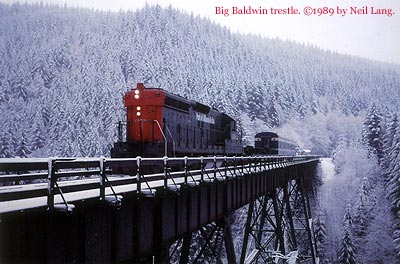 It's a snowy January day in 1989 as SD-9 4368 - with full light package ablaze - makes its way across Big Baldwin trestle with a Hillsboro-bound special consisting of a flat car loaded with parts and private car Yerba Buena. The Yerba Buena was refurbished in Tillamook by Steele/Raeder from ex-C&NW business sleeper Imperial Drive and is still in charter service for owner Rail Ventures of Sandpoint, ID. I don't know what the flat car was about, but it appears to have one or two passenger car truck frames on it, probably bound for Forest Grove. Photo by Neil Lang. January 6, 1989.