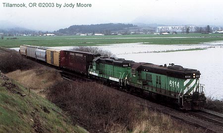 In case you have missed the updates, the Port of Tillamook Bay recently bolstered its motive power fleet with the purchase of 10 SD-9's from Burlington Northern-Santa Fe. The purchase was made in December, and the units started trickling in in mid-February. The last one, BN 6156, arrived in mid-April. None of the units were operational when they arrived, but some were in far better shape than others as the motive power-heavy BNSF was sidelining the older units anytime they suffered a failure of any kind - minor or major. Anyhow, I thought that it would be a perfect introduction to the POTB's splash of green if I included them in a photo of the month. It's also the perfect segue to the photo essay feature that I am working on on the movement and arrival of the units on Port property. Here we see the 6114 and 6139 backing out towards the industrial park in Tillamook. You can learn more about the 10 units by following this link to the roster page. Photo by Jody Moore. March 9, 2003.