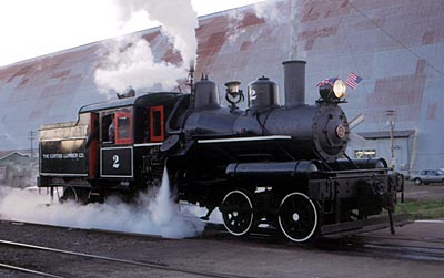 Steam on the Port of Tillamook Bay? That's right! And if you want to take a ride behind this engine, run don't walk to the nearest POTB passenger station. Former Curtiss Lumber Co. Heisler no. 2 was under steam for a short late afternoon shakedown and test about two months after arriving on Port rails. It was her first time under steam since restoration and a brief operation by the Mount Rainier Scenic Railroad two years ago. The two spot, owned by Chehalis transplant Scott Wickert, will be powering rides along the coast during summer weekends in place of the usual RDC runs. Like the RDC, the schedule varies from week to week, so your best bet is to check one of the Port passenger shelters (located in Garibaldi, Rockaway Beach and Wheeler) for schedule information. Photo by Jody Moore. January, 2003.