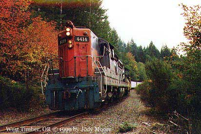 The fall colors were pretty thin when I visited in the beginning of October, but I was able to catch the 4414, 4406 and 4432 heading up the eastbound hill train through this splash of color about a mile from Timber. Photo by Jody Moore. October 11, 1999.
