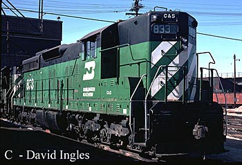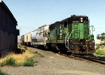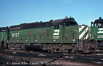 | 6113 was a boomer for Burlington Northern. For a long stretch, it was a common unit on the locals around Pasco, WA, where we caught it with a caboose in tow on the Big Pasco local in Spring, 2000. Photo by Jody Moore. | James Klas grabbed this roster shot of the relatively newly painted 6157 at BN's engine facility in Cicero, IL in November, 1975. Photo from the Keith Ardinger collection. |