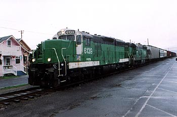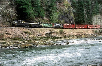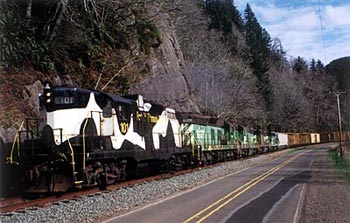 | In late February, the 6178 was placed on the hill freight's consist. A westbound train of empties is drifting downgrade along the Nehalem river near MP 817 with the 78 and 4414 trailing the 4406 and 4405. Photo by Jody Moore. | 6139 entered service on March 2, followed by the 6114 on March 6. We caught up the pair on March 7 as they guided the coast switch through Rockaway Beach on the way back to Tillamook. Photo by Jody Moore. |