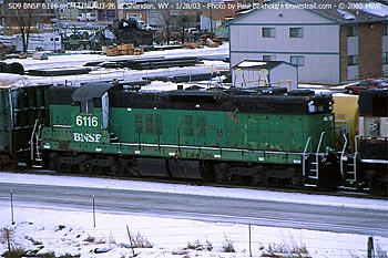 | The hardest part of gathering the information when I found out the units were coming was distinguishing between the locomotives that still carried their BN numbers and those that had been renumbered into the BNSF system. 6116 was one of the latter, originally BN 6228. (not to be confused with BN 6116, ex-GN 589, which was retired before the merger.) Here's our unit as Colorado & Southern 833 at Denver on March 29, 1975. Photo by David Ingles from the Keith Ardinger collection. | Paul Birkholtz sent us this photo of BNSF 6116 as it rolled through Sheridan, WY trailing the power on train M LINLAU3-26, a merchandise train from Lincoln, NE to Laurel, MT on Jan. 28. The 6116 was destined to be parked in Tacoma for an extended stay. You can visit Paul's website at www.mtnwestrail.com to see more of his work from around the west. |