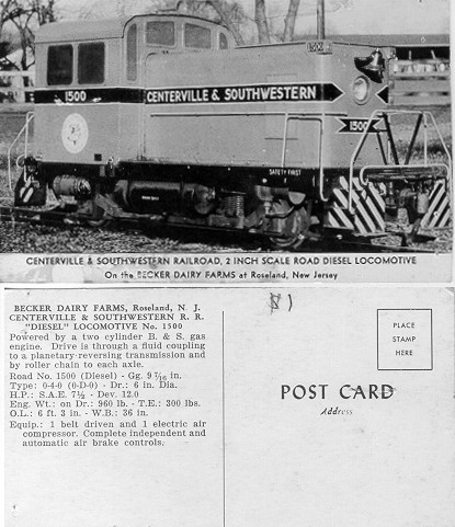 | Centerville & Southwestern #1500 Diesel Switcher Engine. Post card of the engine. | ||