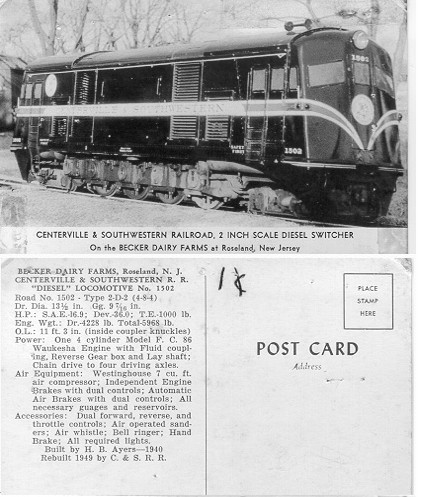 | Photo 2: Centerville & Southwestern #1502 Double Ended Diesel Engine. Post card of the engine. | ||||