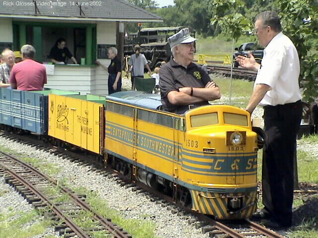 Photo #6: Three photos from our July 14, 2002 Open House. Conductor John Bonor confers with Engineer Bob Bennington as Evelyn Bennington and Rebecca Winter do business at the Ticket Booth. Bob was one of the engineers that ran the C&S on the Becker Dairy Farm.