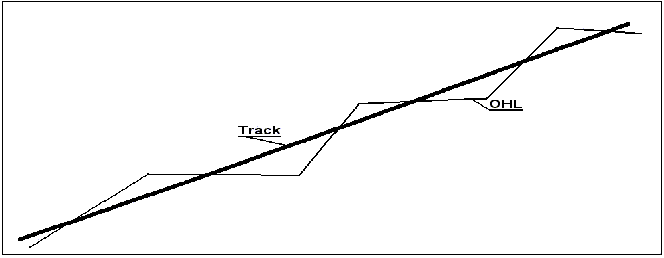 The contact wire is the wire immediately in contact with the pantograph of the train. The current is transferred from the wire to the pantograph. On top of each pantograph is a set of carbons. These eventually wear due to the continuous contact with the OHL and this is the reasoning behind stagger. Stagger All OHL is staged in relation to the track to promote even wear of the carbon strips on train pantographs. The stagger is represented in the following simple diagram.