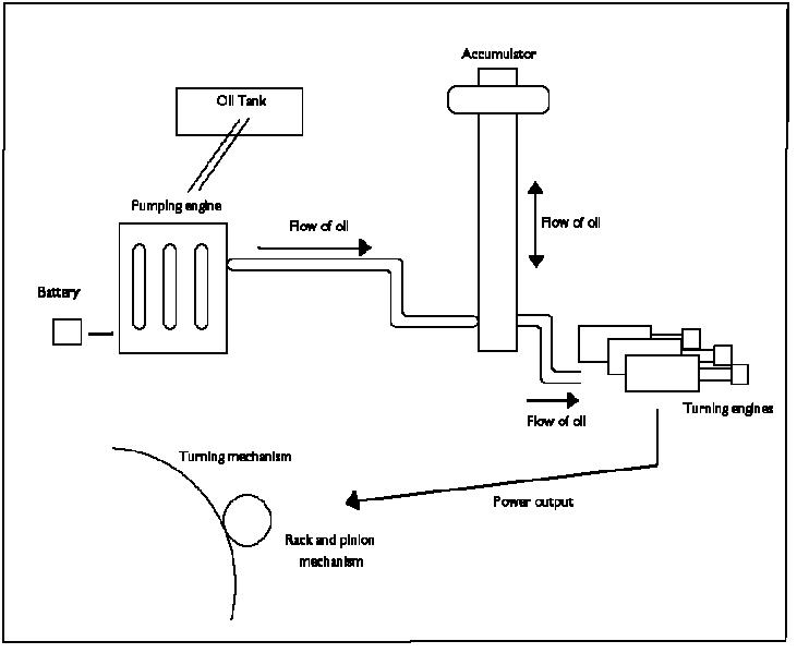 ![]()             The pumping engine draws oil from the oil tank and pumps up the pressure, ensuring that the oil flows to what is known as the accumulator. The accumulator weights are consequently pumped up the accumulator by the pressure of the oil. Once the accumulator is filled, the operator can release the weight at the top. The oil is forced out of the accumulator due to the weight, and is pushed into one of the two turning engines. The oil operates the turning engines, and the motion from these is transmitted to a rack and pinion mechanism. This operates the rotation of the bridge. Selby swing bridge is very similar to Goole swing bridge, however it is considerably smaller. Selby Swing Bridge can be seen below.