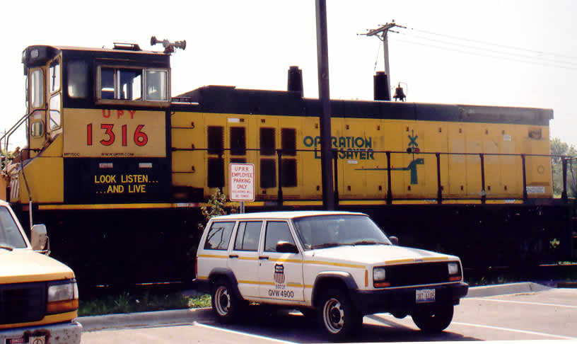 UP Yard 705, a GP 15-1, heading north across Main St. in Crystal Lake, IL UP Yard 1315, a MP15DC in ex-CNW colors, sits near the UP and Metra offices in Crystal Lake, IL