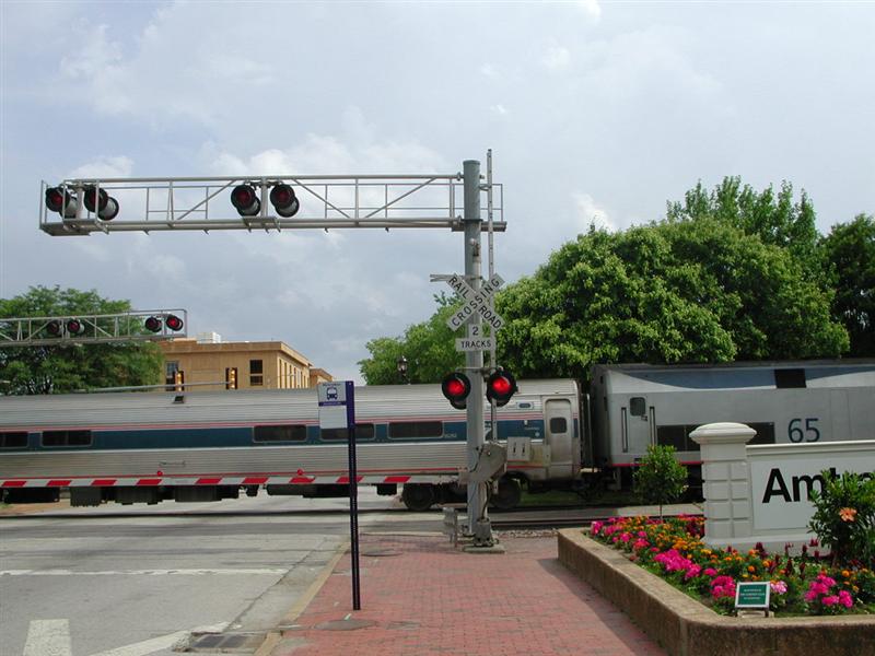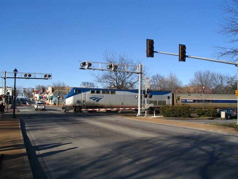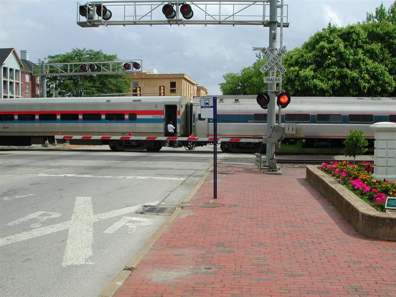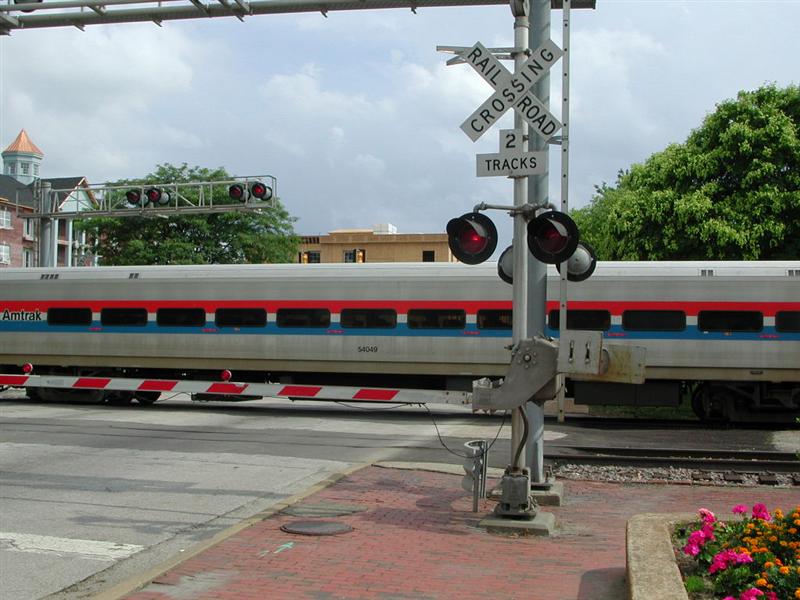 Amtrak sits on a crossing waiting to board passengers. |