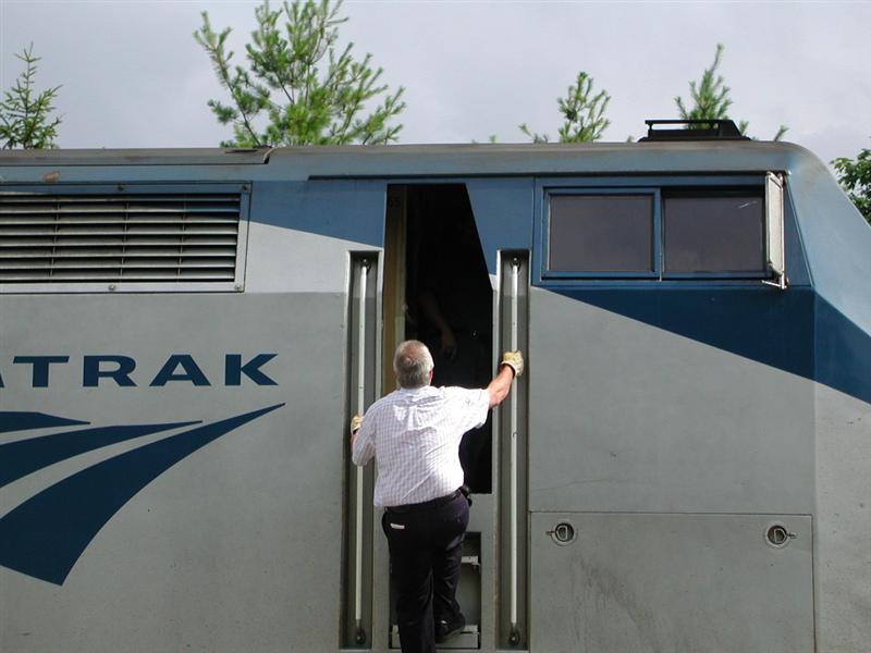 | The engineer climbs into the cab. |