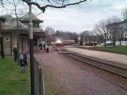 Amtrak passing by museum of transportation. |
