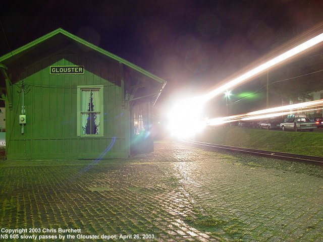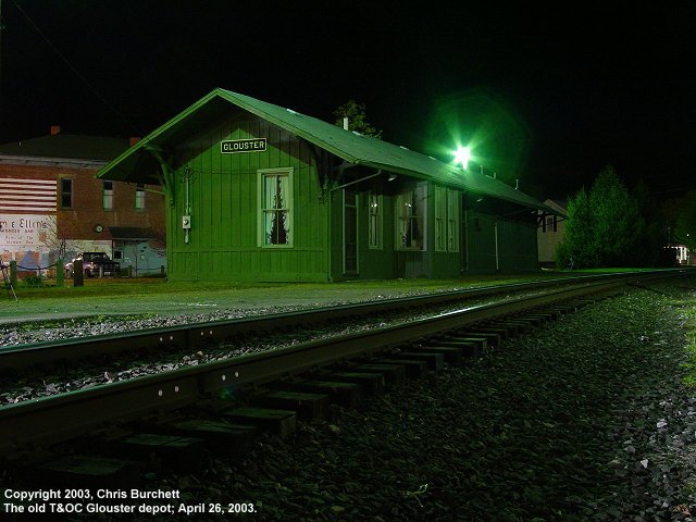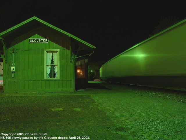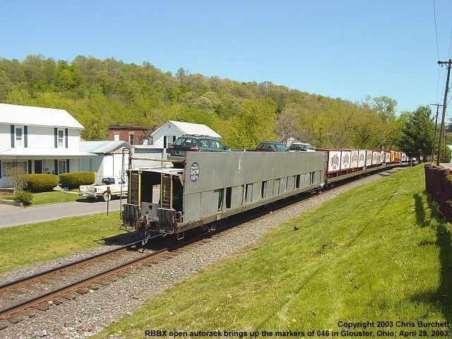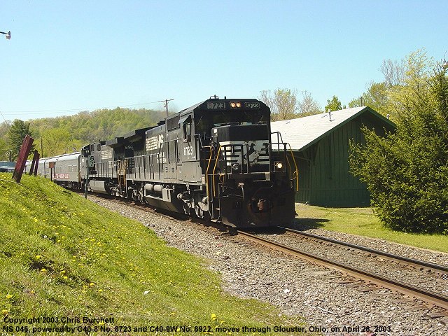 After waiting a little over an hour in Glouster, train 046 finally rounded the curve in front of the station. The locomotive consist, C40-8 No. 8723 and C40-9W No. 8922, was in charge of fifty-seven cars. The consist included an assortment passenger cars, flats, and an open autorack bringing up the markers.