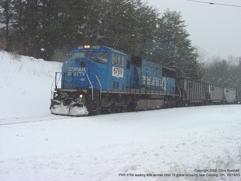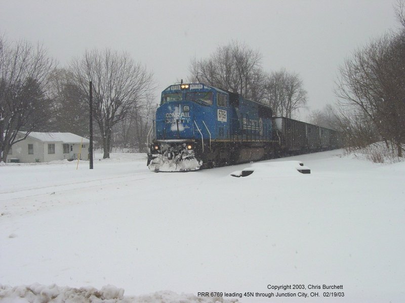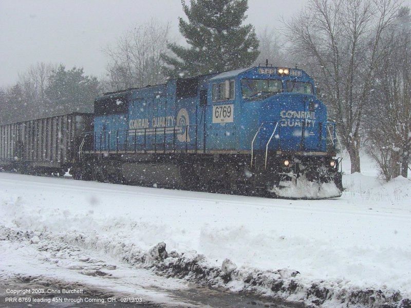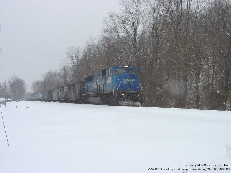 As the snow begins to fall again, PRR SD60M no. 6769 North leads the 45N through Armitage with fifty cars in tow on February 19, 2003.