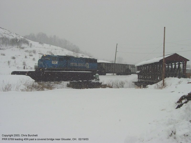 The chase was on after the 45N passed through Armitage. At the covered bridge just off Ohio Route 13, the 45N passes by with the snow really picking up now. The bridge is under restoration, allowing for many more photographs to be taken here.