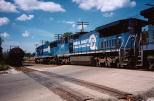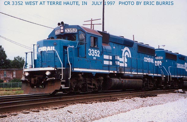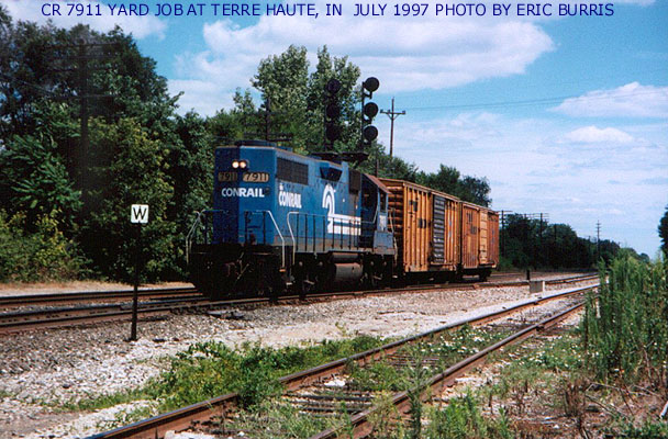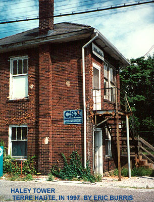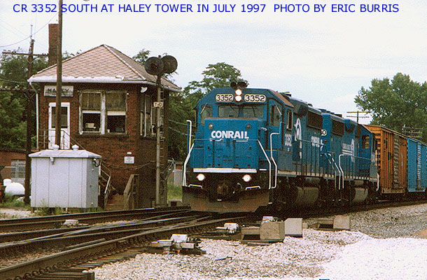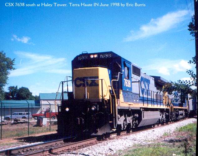 At Terre Haute, Indiana there's a signal tower that still operates as it always did. Haley Tower is still in operation 24 hours a day and is owned and ran by CSX. Haley is where the Conrail St. Louis Line subdivision crosses the CSX CE&D sub ( from Chicago, Illinois to Nashville, Tennessee) and the CR line goes from St. Louis to Alliance, Ohio. This tower is a good spot to watch lots of Conrail and CSX and a few CP Rail trains. The tower will be coming down at anytime due to the planned construction of crossovers from the CR line to the CSX replacing the switch crossing, as a result of CR being split up by CSX and Norfolk Southern. (left) CR 7911 GP38 is the switch engine at Terre Haute that day and makes a few runs past Haley with boxcars. (middle) CR 6761 west passes the street crossing east of the tower. The consist is: CR 6761 SD60, CR6235 DASH 8-40CW and a DASH 8-40C. (right) CSX 7638 south eases past Haley around 11:00a.m. CSX 7638 is a 8-40C and CSX 7737 is a 8-40CW. Photos by Eric Burris in July 1997.