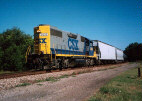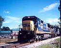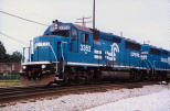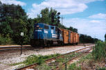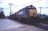 Conrail 3352 west switches the yard for fifteen minutes. CR 3352 and 3340 is a GP40-2. CSX 2174 rushes past nortbound through Haley. CSX 2174 is still in Seaboard System paint except for the front. CSX still has many locomotives that haven't been repainted in CSX colors. The locomotives are as follows: CSX 2174 is a GP38, 7015 a U30C, and 4606 is an SD40. Photos by Eric Burris in July 1997.