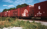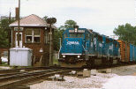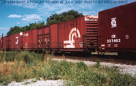 Conrail 5584 east passes by Haley tower in the evening with auto parts boxcars. CR 5584 is a SD60M. Photos by Eric Burris in July 1997.