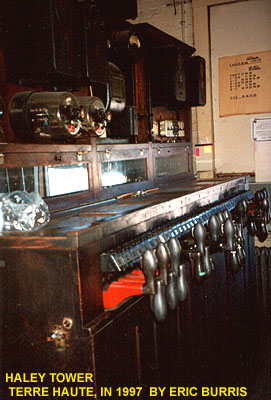 The outside and inside of Haley Tower at Terre Haute, Indiana. Haley has been in operation since 1926. Photos by Eric Burris in July 1997.