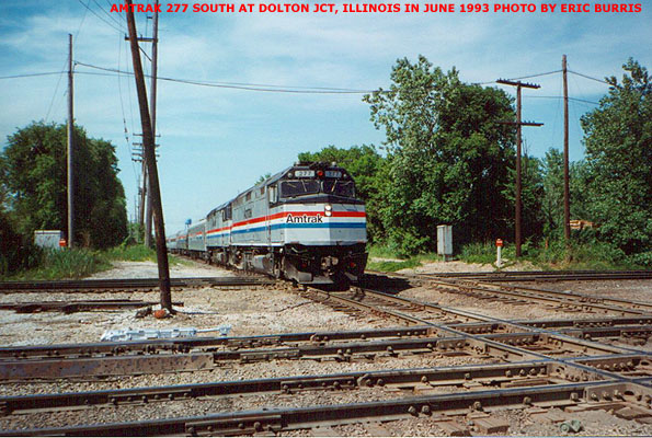 (LEFT) Downtown Chicago the vintage Burlington Northern E-8 locomotives, once used for passenger trains sit at the Metra rail yard in June 1993. This photo was taken out the window of Amtrak #4. (MIDDLE) Amtrak 277 south passes by Dolton Junction in a Chicago Suburb. Amtrak 277 is a F40PH locomotive built by EMD. (RIGHT) Shortly later Indiana Harber Belt 9216 east passes by the junction. IHB 9216 and 9202 are SW1500s built by EMD.