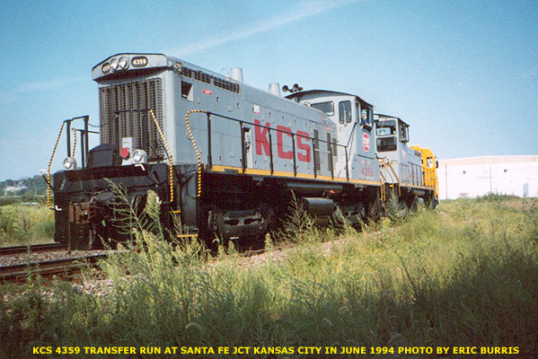 Southern Pacific 8123 east eases through Santa Fe junction after the transfer job passes. SP 8123 is a Dash 9-44CW and the Rio Grande engine number 3008 is a GP30. Kansas City Southern 4359 leads a transfer train westbound over the Missouri River. Photo by Eric Burris