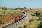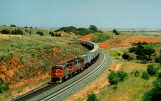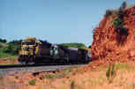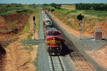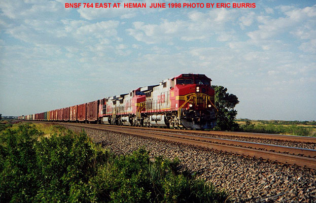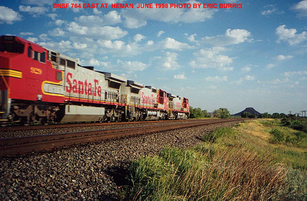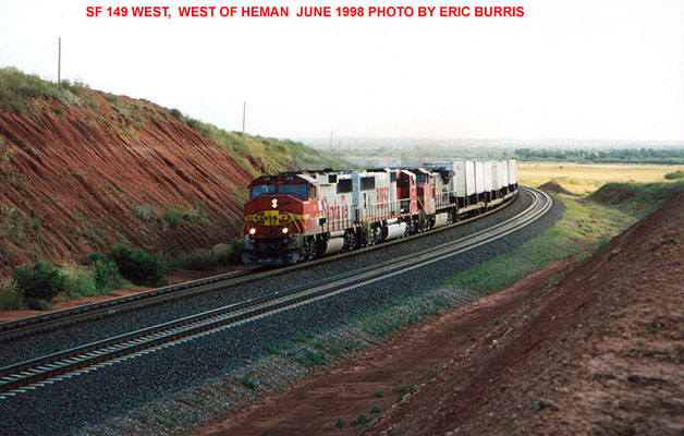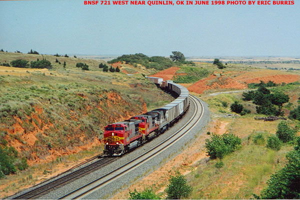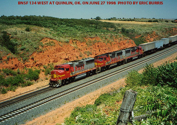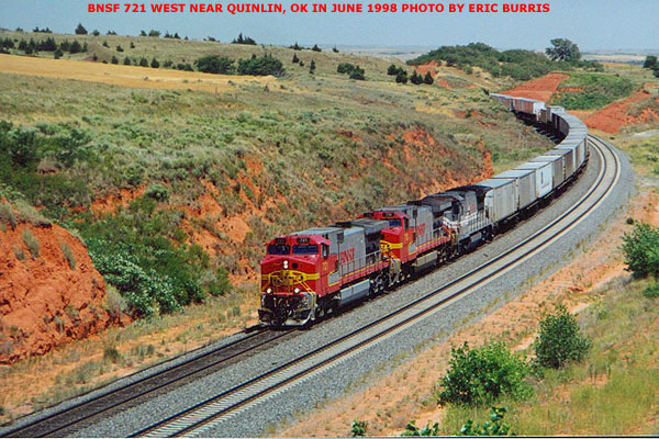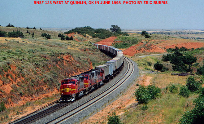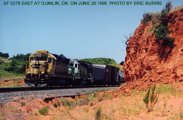 Santa Fe 149 west passes the three mile long curve between Belva and Heman. Santa Fe 888 east passes the signals and the road crossing over the tracks at milepost 359 near the town of Qinlan, Oklahoma on June 25th 1998 (LEFT). SF 888 is a Dash 8-40CW. SF 5378 east passes Quinlan on the same day (RIGHT). Quinlan is two or three miles east of the famous "Curtis Hill" on the Burlington Northern Santa Fe Panhandle subdivision. This is the former Santa Fe Chicago to LA mainline. The grade to Curtis Hill starts at Belva and gets steep at milepost 359. By the time the westbounds get to Quinlin they are struggling to sustain 15-20mph and the locomotives are roaring up a storm. This is a very impressing show. The eastbounds have a slight grade at Curtis before reaching the top. The eastbounds do about 45mph between Curtis and Belva. The double track was added several years ago. The sidings were from the east: Heman, Belva, Quinlan, and Curtis. From Heman to Mooreland the sidings was connected to make double track. Photos by Eric Burris.