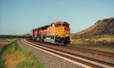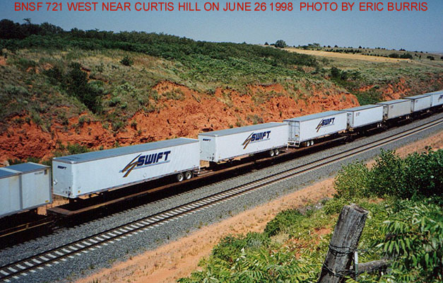 BNSF 721 west works hard uphill at the same location pulling truck trailers on this intermodel train on June 26th 1998. The well done Swift trailers look nice on piggyback trains. Photos by Eric Burris.