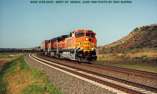 BNSF 764 east approaches Heman, OK at about 45 mph. Note the volcano-like hill in the background. At the three-mile curve BNSF 4755 east rushes by. 4755 is a new Dash 9-44CW purchased by BNSF and painted in the newest paint scheme called the Heritage 2. It is known to railfans as the "warpumpkins".