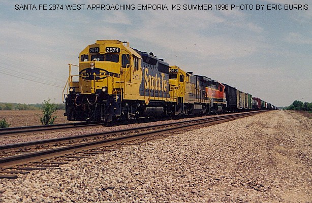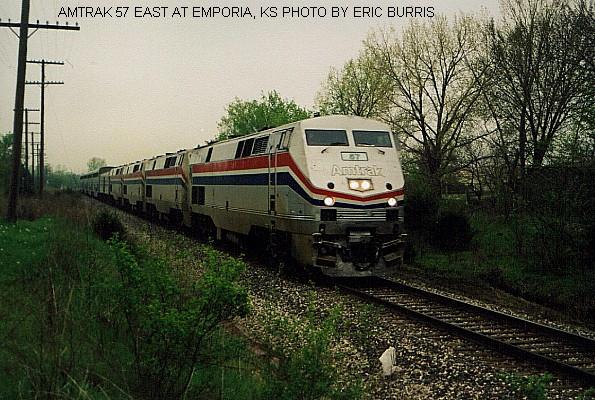 Amtrak #4 the Southwest Chief hurries its' way to Chicago running very late. Amtrak 57 leads this train. Santa Fe 2874 west approaches Emporia, Ks. Photos by Eric Burris.
