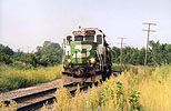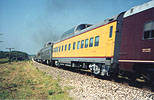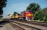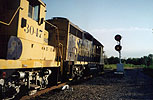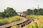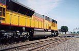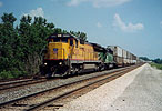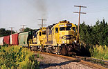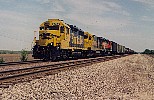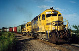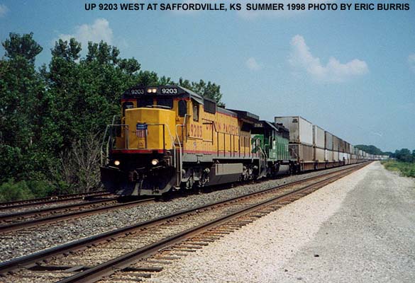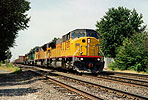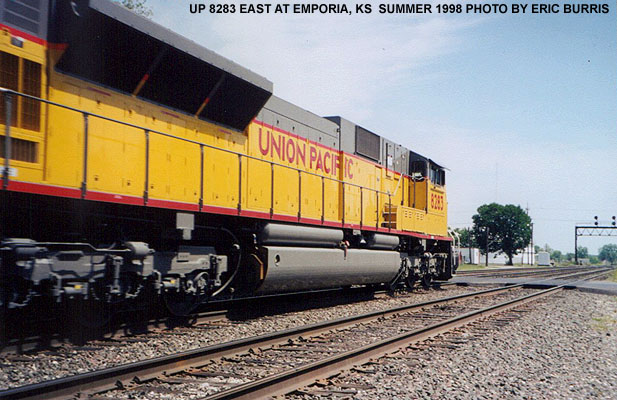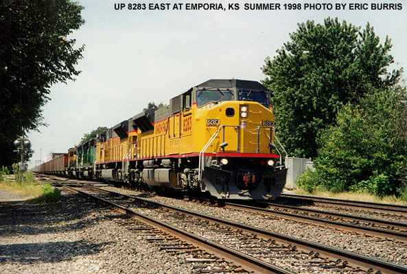 UP 8283 east passes through the same location at Emporia, late summer 1998. The train symbol is C-TPKRDR.