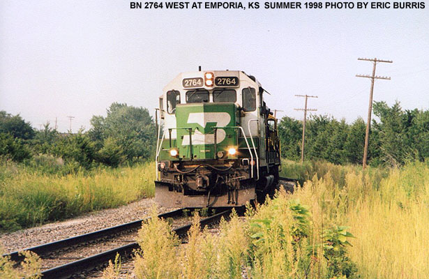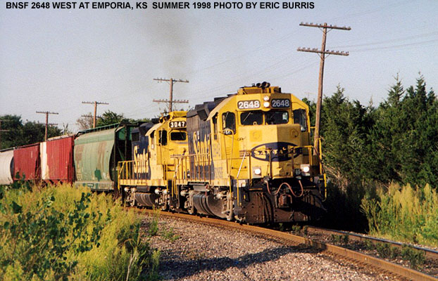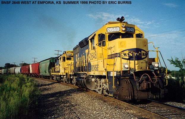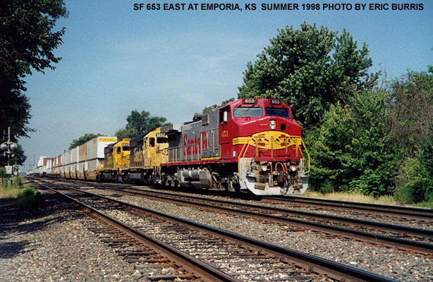 Union Pacific 9203 west passes Saffordville, KS on it's way to Hutchison, ks with trackage rights on BNSF. 9203 is a Dash 8-40C. Santa Fe 653 east passes through Emporia, KS with a pure Santa Fe consist.
