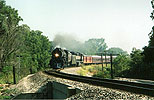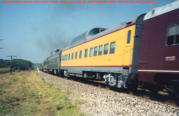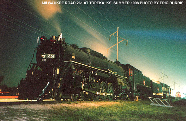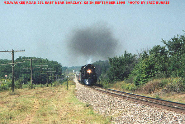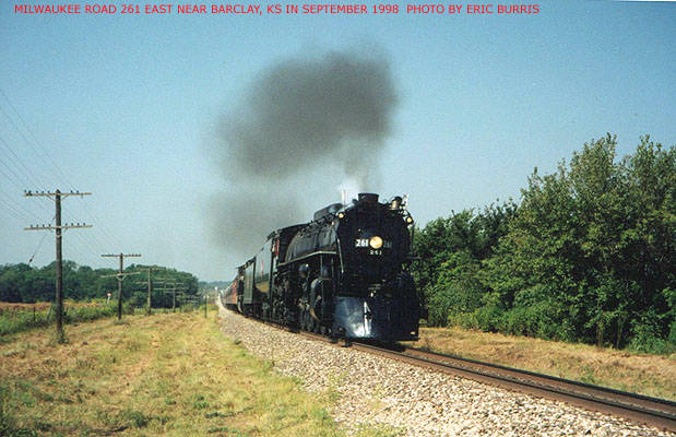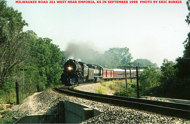 On September 5, 6, and 7 1998 the Milwaukee Road 261 pulls the Topeka Railroad Days excursion train to Emporia round trip back to Topeka. The first picture it's sitting at Forbes Field south of Topeka where Railroad Days is held. The second picture is a few miles northeast of Emporia as 261 is headed toward Emporia at about 10:00am. Photo by Eric Burris.