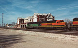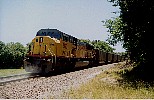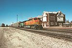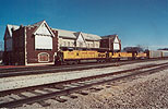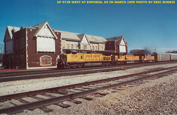 Burlington Northern 3140 leads two "pumpkins" on this westbound train. The lead engine is a GP50 and the 2nd two are SD40-2s. Union Pacific 9728 west detours on the BNSF Emporia subdivision in March 1999. UP 9728 is a Dash 8-40CW. Sometimes when the UP Marysville sub is congested UP runs on seldom used trackage rights from Kansas City to Hutchison, KS. At Hutchison the train enters the UP (former SP) Cotton-Rock line the runs from Topeka to Tucumcari, New Mexico. Photos by Eric Burris