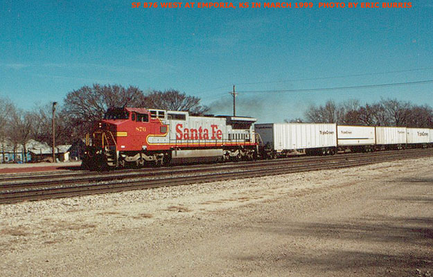BNSF 4311 east is switching at the Emporia, Ks yard in March 1999. 4311 is a new Dash 9-44CW. After the BNSF 4311 leaves, Santa Fe 876 leads a Triple Crown Roadrailer westbound at Emporia. SF 876 is a Dash 8-40CW. Photos by Eric Burris.
