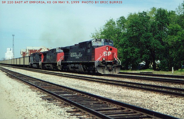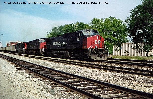 Southern Pacific 220( AC4400CW)east makes one of the first few runs to the KPL Power plant at Tecumseh, Ks on the BNSF Topeka sub. This trains is passing Emporia, ks at milepost 112 on May 9, 1999. The KPL/Pueblo coal trains come regularly since then several a week. They come from a Colorado coal mine. Photos by Eric Burris.